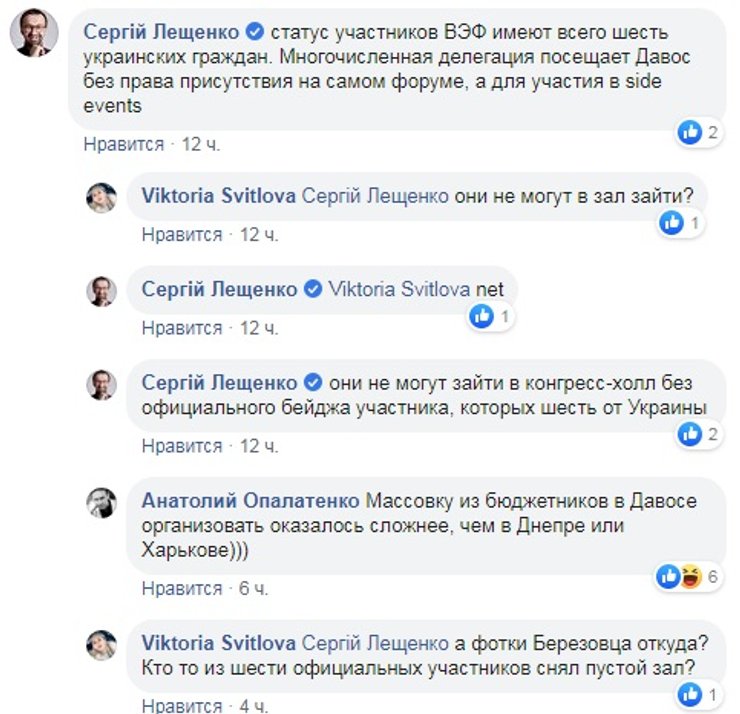 Экс-нардеп Сергей Лещенко пояснил, что не все посетители Давоса имеют статус участников форума и могут присутствовать на всех выступлениях. Но даже в таком случае присутствующих в зале все равно было мало.