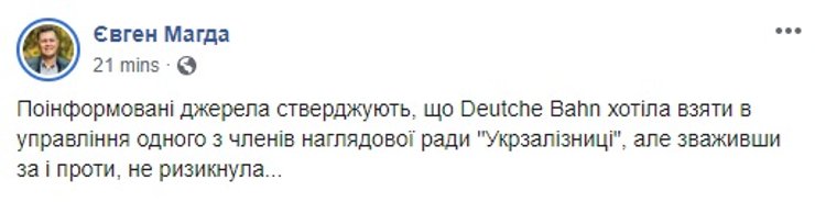 22 января Мининфраструктуры подписало "Меморандум о взаимопонимании" с железнодорожным оператором Германии Deutsche Bahn. О важном событии первым сообщил премьер-министр Алексей Гончарук. По его словам, применение опыта самой успешной европейской железной компании повысит эффективность и качество перевозки транспорта в Украине. При этом он сразу уточнил, что о продаже или аренде стратегического предприятия речи не идет, а немецкие специалисты будут только работать над реформированием механизмов управления компании.