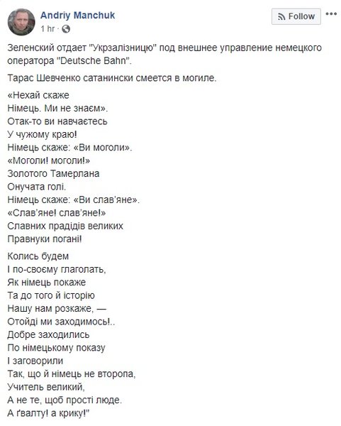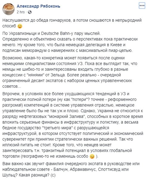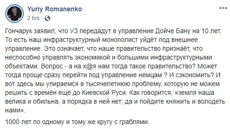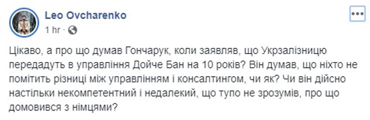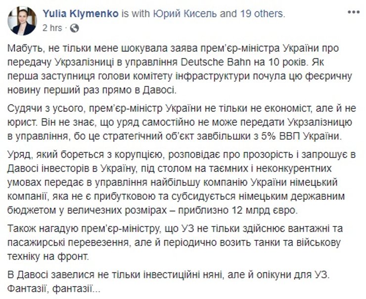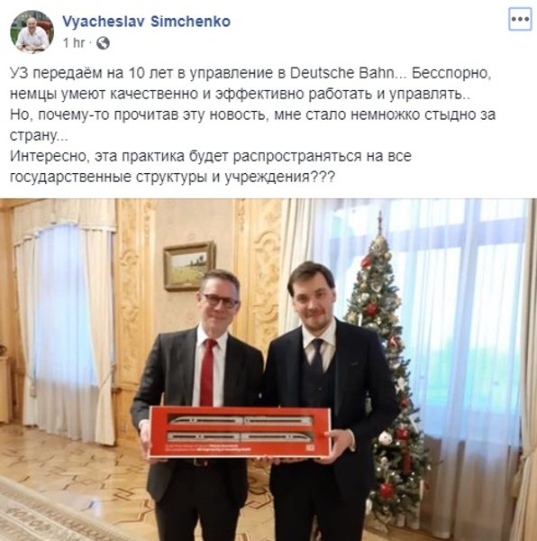 Премьер-министр Алексей Гончарук на Украинском завтраке в Давосе заявил, что Укрзализныцю передадут немецкой железнодорожной компании Deutsche Bahn в управление на 10 лет, вызвав в соцсетях горячие дискуссии о суверенитете и внешнем управлении, а после опровержения со стороны Deutsche Bahn — искреннее недоумение.