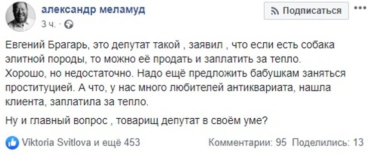 Уже сегодня нардеп принес извинения. Брагар пояснил, что не хотел никого обидеть, а только привлечь внимание к проблеме, когда состоятельные люди пытаются оформить субсидию. Но из-за неопытности выбрал неудачные формулировки.