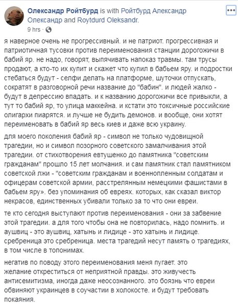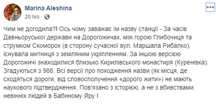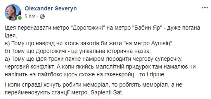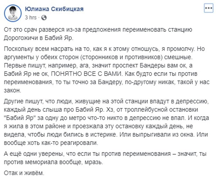 В ходе дискуссий также выяснилось, что остановка с названием "Бабий яр" существует, только наземная. И если ее существоание не вызывает душевных мук, значит, и переименование станции метро пройдет безболезненно.