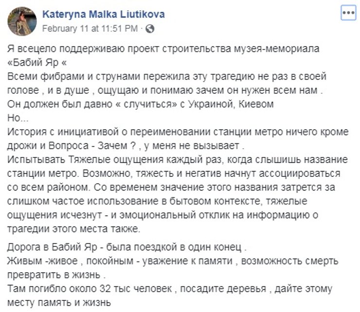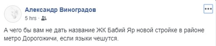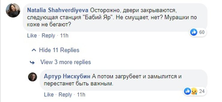 Часть противников переименования также заявили, что это повлечет за собой нивелирование названия и трагедии, с которой оно ассоциируется. Ведь тяжело относиться уважительно к местности под названием "Бабий яр", если ты периодически назначаешь там встречи, садишься в метро и ходишь по барам.