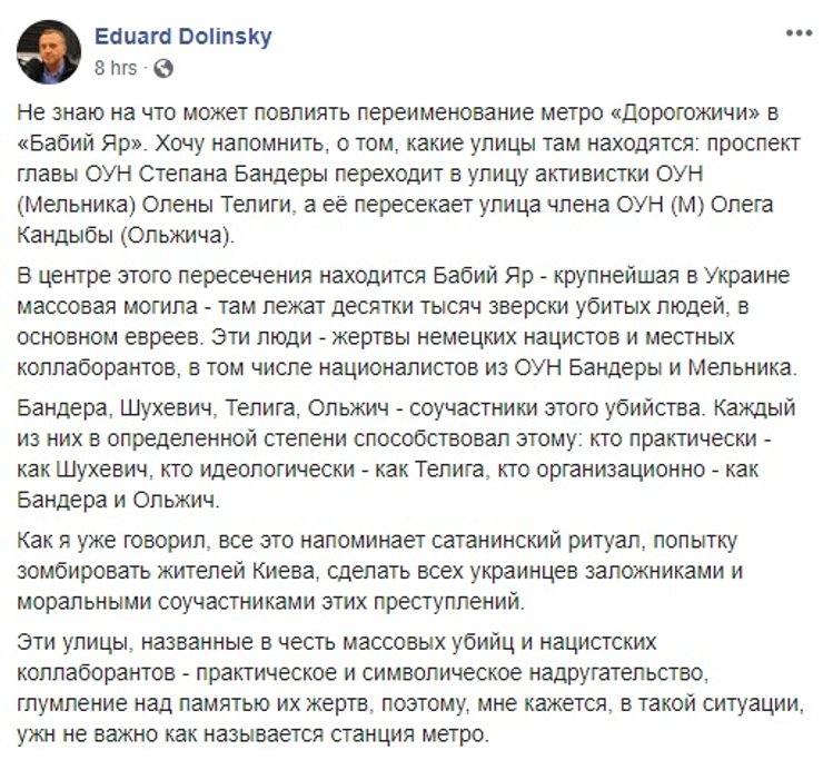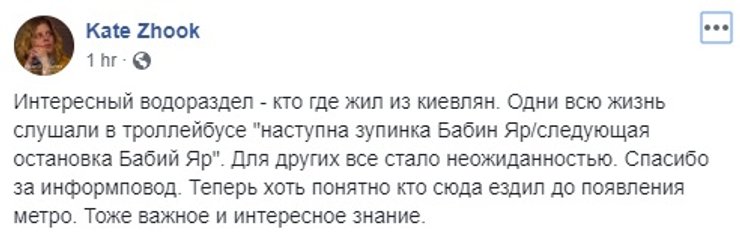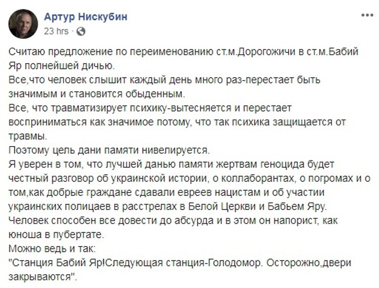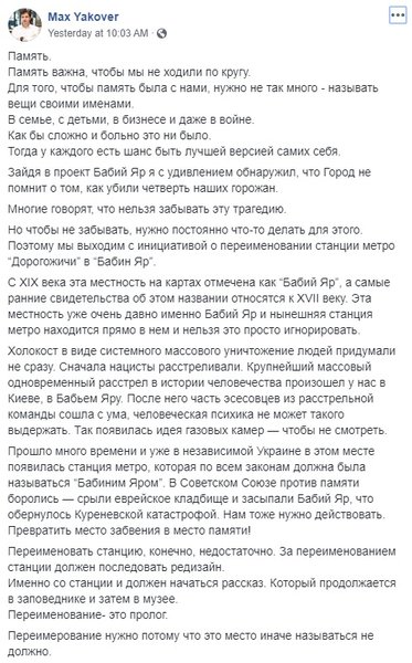 И "превращение места забвения в место памяти — это наш долг перед Киевом, перед всем миром и перед будущими поколениями. Убежден, что переименование станции метро "Дорогожичи" в "Бабий Яр" будет способствовать переосмыслению киевлянами этой местности", — резюмировал Яковер.