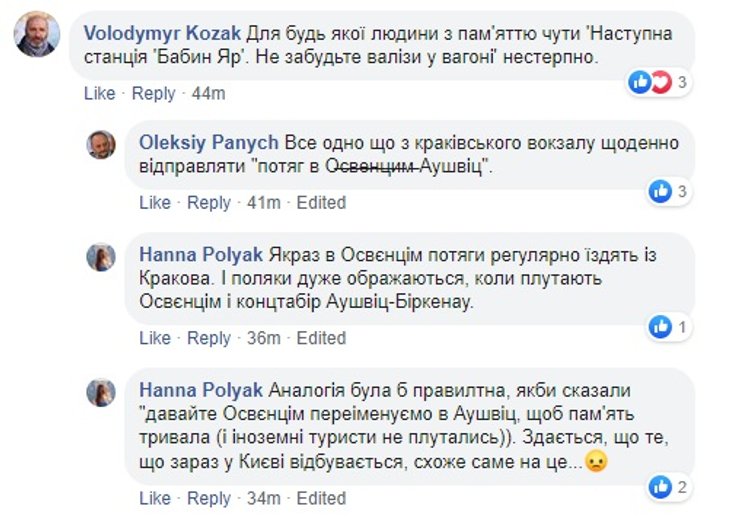 Инициатива переименования вызвала бурное обсуждения в соцсетях. Потому как ранее смена названий чаще всего происходила в рамках декоммунизации. Причем предложенное название — также историческое — вызывает печальные и гнетущие ассоциации. И это был один из аргументов против. Многие киевляне отмечат, что, мол, все и так знают, что за парк с многочисленными мемориалами (сейчас их 25) расположен у станции метро "Дорогожичи" и тянется вдоль улицы Елены Телиги. А переименование станции в "Бабий яр" это слишком страшно.