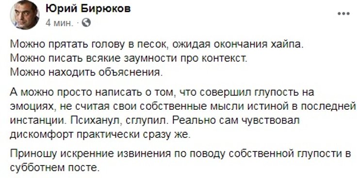 "Можно писать всякие заумности про контекст. Можно находить объяснения. А можно просто написать о том, что совершил глупость на эмоциях, не считая свои собственные мысли истиной в последней инстанции. Психанул, сглупил", - написал Бирюков.