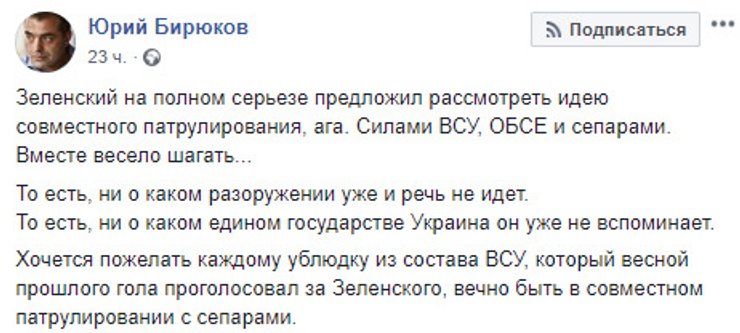 15 февраля Бирюков написал в Facebook пост, в котором пожелал "каждому ублюдку из состава ВСУ, который весной прошлого года проголосовал за Зеленского, вечно быть в совместном патрулировании с сепарами". На данный момент пост уже удален.