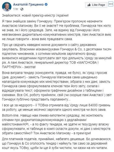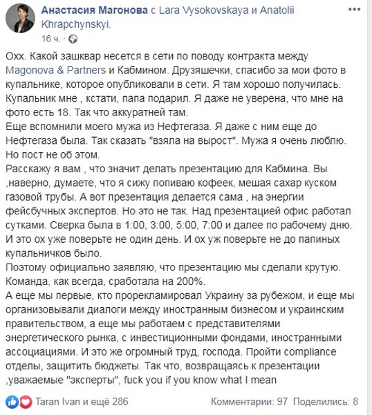 Презентацию отчета в виде слайдов Кабмин заказал пиар-агентству Magonova & Partners, которое принадлежит Анастасии Магоновой, жене главы газового дивизиона Нафтогаза Андрея Фаворова. Об этом первым сообщил нардеп от "Слуги народа" Максим Бужанский, который возмутился, что правительство не смогло сделать слайды своими силами и решило обратиться к помощи частных структур.