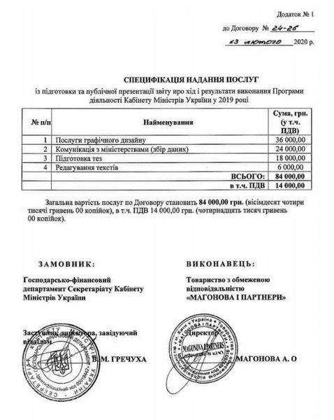 Отметим, что в договоре Кабмина с агентством указано, что озвученная выше сумма была заплачена за услуги по подготовке и публичной презентации отчета правительства, а отдельной строкой расходов указывается "коммуникация с министерствами.". В то же время сама Магонова говорит лишь о подготовке презентации. Из-за чего сохраняется некоторая интрига. Или Кабмин заказал написание собственного отчета за 84 тыс. гривен у пиар-агентства, что выглядит не очень серьезно и может указывать на неспособность Кабмина сделать это самостоятельно, или 84 тыс. гривен бюджетных денег потратили на работу по прочтению уже готового отчета и созданию слайдов, что, конечно, нельзя назвать адекватной стоимостью.