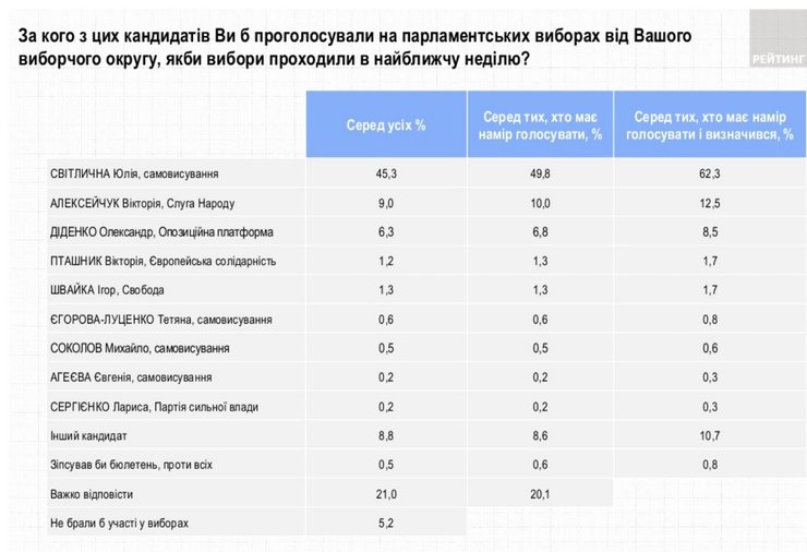 - Наибольшие шансы на победу на округе – у Юлии Светличной, которая была главой Харьковской ОГА с 2016 года. На этой должности она сменила Игоря Райнина, который перешел на работу в администрацию пятого президента Петра Порошенко.
