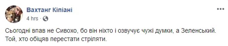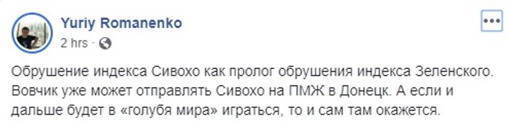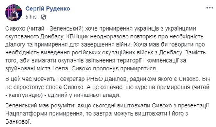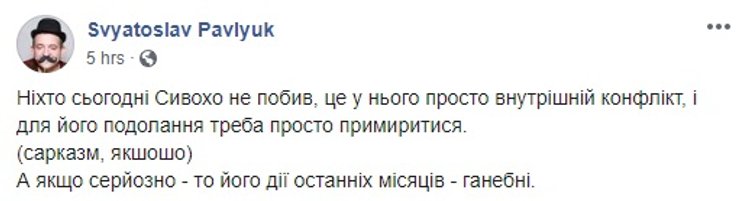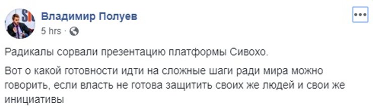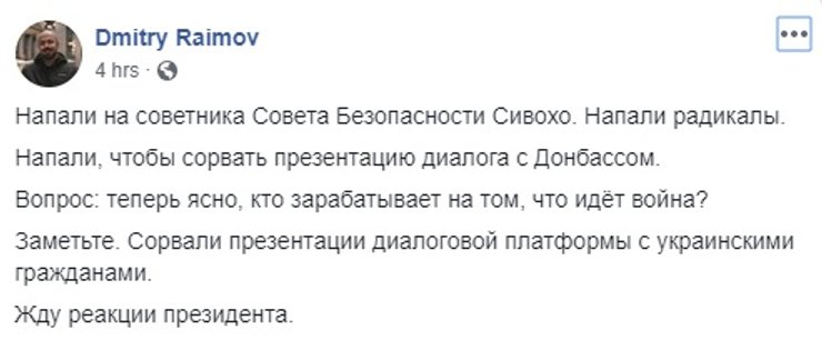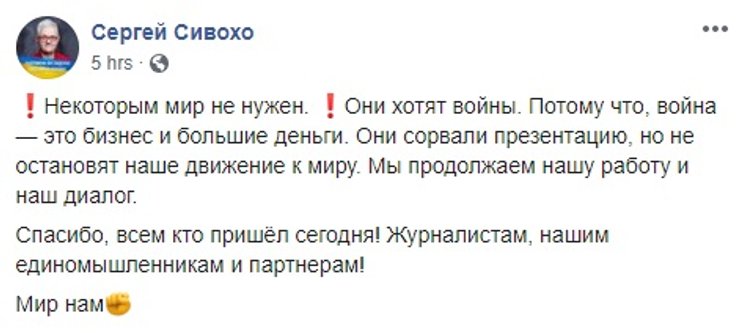 Сам Сивохо написал пост, в котором заявил, что загадочные "они", видимо Нацкорпус, или те, кто за ним стоит, "хотят войны. Потому что война — это бизнес и большие деньги. Они сорвали презентацию, но не остановят наше движение к миру. Мы продолжаем нашу работу и наш диалог".