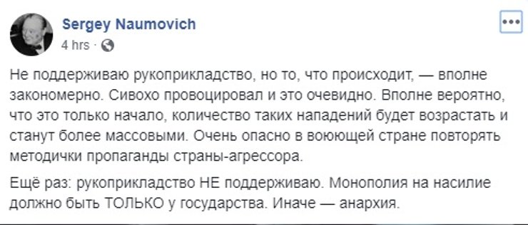 Впрочем, часть лидеров общественного мнения посчитали, что Сергей Сивохо был наказан за свои необдуманные слова, а Нацкорпус якобы просто выразил действиями то, что многие критики советника секретаря СНБО писали в комментариях. Некоторые при этом умудрились соблюсти этикет и осудить рукоприкладство.