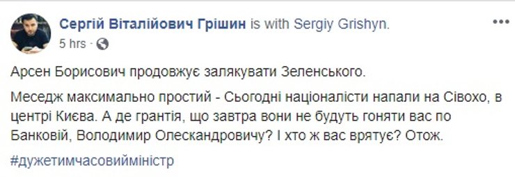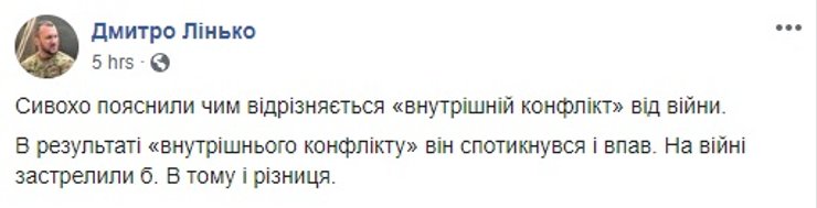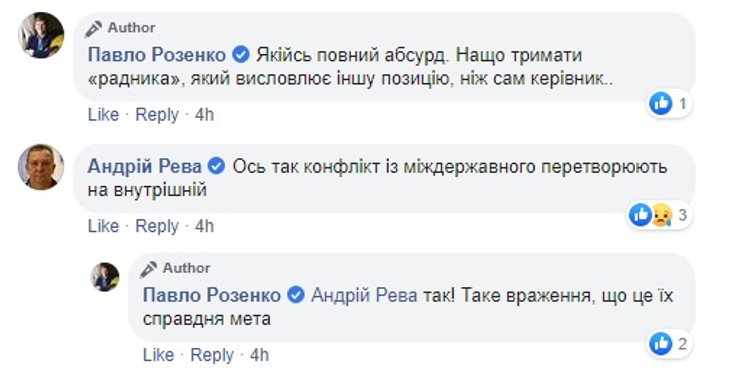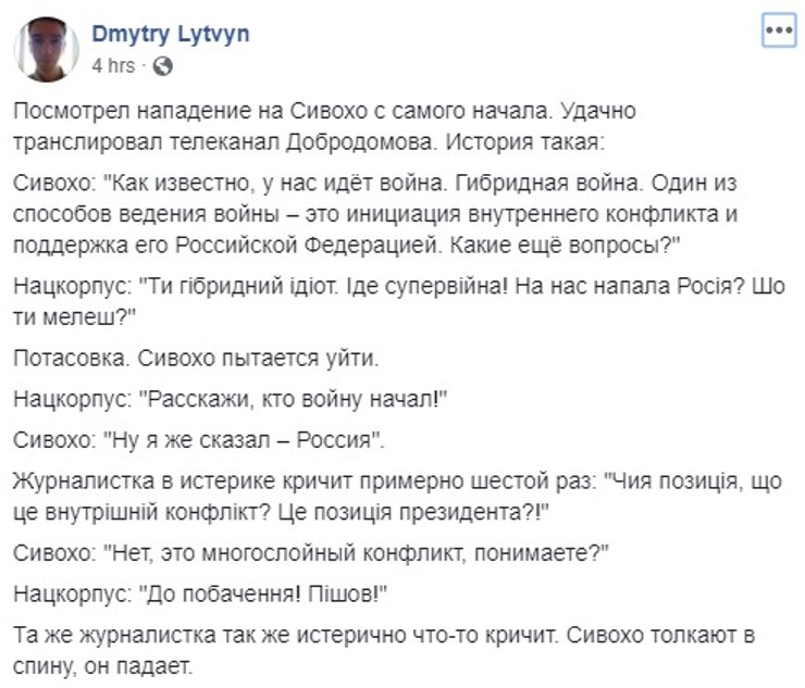 "Про внутренний конфликт. Как известно, у нас идет гибридная война. Один из способов ведения войны — это инициация внутреннего конфликта и поддержка его Российской Федерацией. Какие еще вопросы", — заявил Сергей Сивохо. Это, впрочем, спор не разрешило и советник секретаря СНБО получил удар по спине.