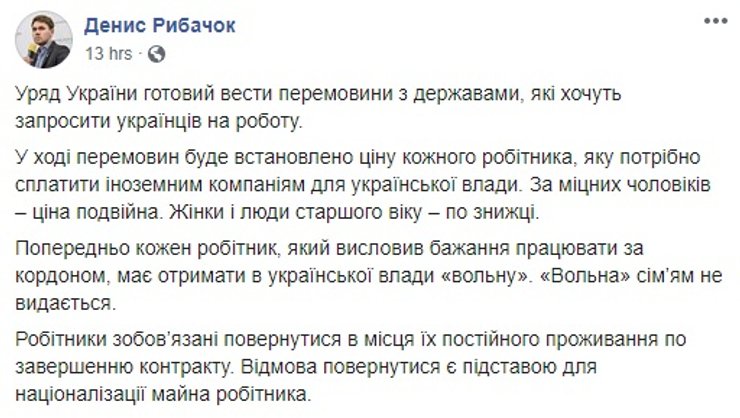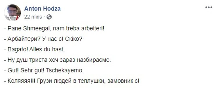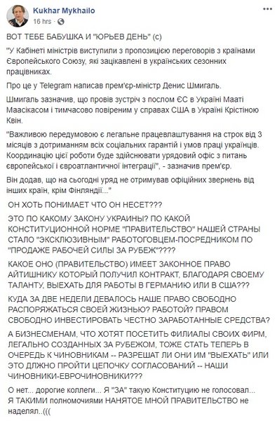После эпопеи с отменой чартеров, на которых украинские заробитчане должны были улететь в Финляндию и Великую Британию, премьер-министр Денис Шмыгаль решил выложить все карты на стол и заявил о готовности правительства выступать посредником между украинской рабочей силой и развитыми странами, которым нужны сезонные работники. Такая забота, однако, не вызвала понимания у украинцев в соцсетях, которые обвинили власть в нарушении Конституции и, как это обычно происходит, стали соревноваться в остроумии