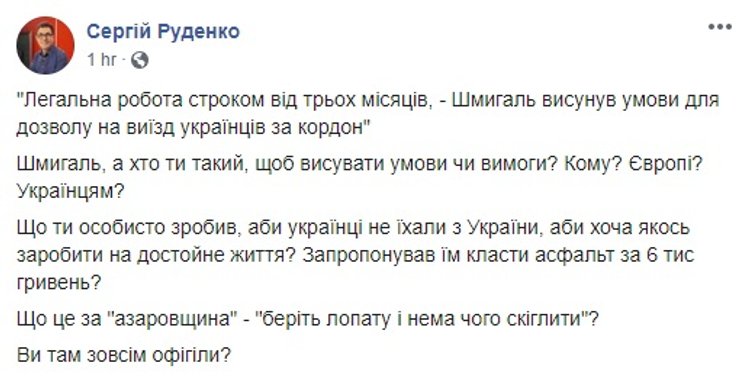 Несмотря на то, что пост Шмыгаля о "помощи с трудоустройством" собрал уже более полутора тысяч гневных комментариев, премьер-министр более ничего на эту тему не говорит и не пишет. Из-за чего пока нельзя понять, осознал ли он неготовность граждан мирно согласиться с его видением преодоления кризиса и будет ли такая политика продолжаться и дальше.
