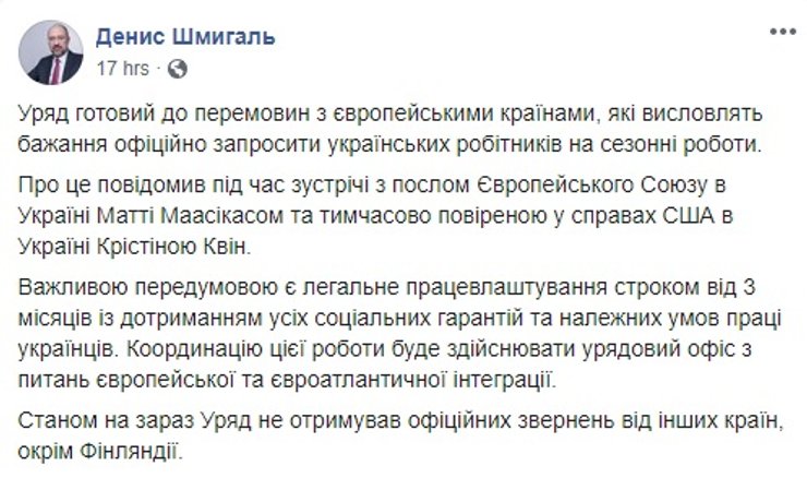 Денис Шмыгаль на своей странице в Facebook отметил, что провел встречу с послом ЕС в Украине Маати Маасикасом и временно поверенным в делах США в Украине Кристиной Квин. "Важной предпосылкой является легальное трудоустройство на срок от 3 месяцев с соблюдением всех социальных гарантий и условий труда украинцев. Координацию этой работы будет осуществлять правительственный офис по вопросам европейской и евроатлантической интеграции", - отметил премьер.