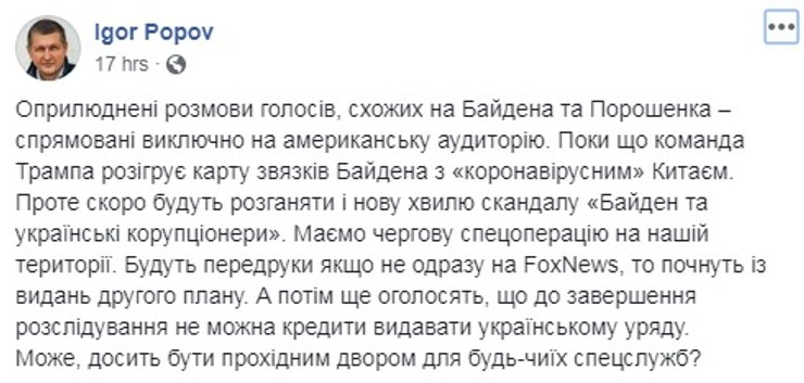 "Европейская солидарность" назвала публикацию записей "российской провокацией, которая не имеет ничего общего с реальностью". "Их цель – подорвать двухпартийную поддержку Украины со стороны Соединенных Штатов", – заявили в политической силе. И это несколько забавно, потому что соратники Порошенко уже написали посты, в которых не подтверждают его сговор с Байденом, но и не отрицают его полностью.