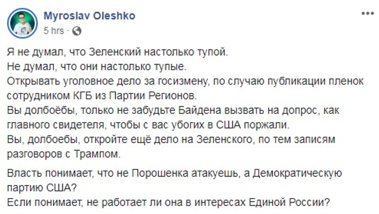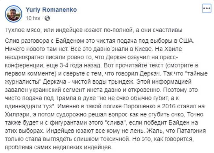 В украинских соцсетях высказывают мнения, что внезапно появившийся нардеп Деркач с записями, полученными от таинственных журналистов-расследователей — это ничто иное, как удар по президентским перспективам Байдена, а Украина здесь выступает в роли объекта и поля боя чужих спецслужб.