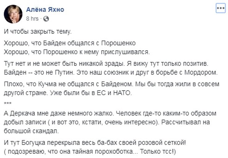 Во время следующего разговора якобы Байден приветствует назначение нового генпрокурора и говорит, что ему нужно будет работать над "возмещения ущерба" от деятельности Шокина.