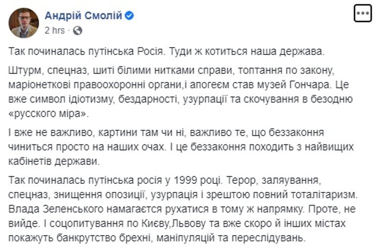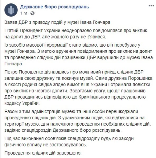 ГБР срочно написали новый пост, в котором заявили, что ехали в музей вручать повестку Петру Порошенко, но тот оперативно "покинул музей", поэтому повестку вручили его жене, а суровые парни в бронежилетах были нужны, чтобы противостоять администрации музея и "другим лицам". Но никакого физического воздействия не понадобилось, а проведение следственных действий закончилось.