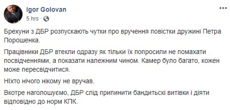 В свою очередь адвокат Порошенко Игорь Головань заявил, что никакую повестку Марине Порошенко сотрудники ГБР не передавали.