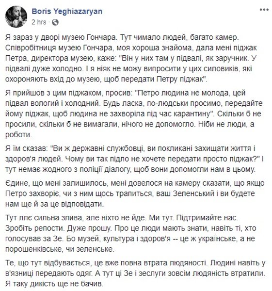 При этом один из участников событий рассказал о своих неудачных попытках передать пиджак директору, запертому в холодном подвале. Где, по всей видимости, и находится кабинет директора музея, в котором его блокировали сотрудники ГБР.