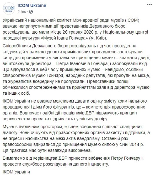 В свою очередь Украинский национальный комитет Международного совета музеев выразил протест действиям ГБР.