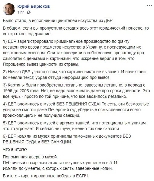 Государственное бюро расследований хотело удостовериться, что картины Петра Порошенко, выставку которых он открыл в музее Ивана Гончара, ввезены в страну законно, а заодно вручить пятому президенту Украины повестку на допрос в качестве свидетеля по делу о незаконном перемещении через границу коллекции культурных ценностей. Повестка в итоге была передана Марине Порошенко, а бойцам удалось сломать дверь
