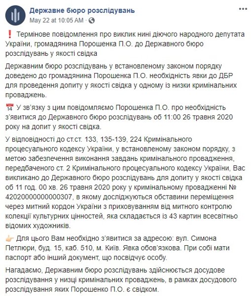 История про картины Порошенко началась 22 мая, когда ГБР опубликовало у себя на сайте заметку о том, что Петра Порошенко вызывают на допрос в качестве свидетеля по делу о незаконном перемещении через границу коллекции культурных ценностей, которая состоит из 43 картин.