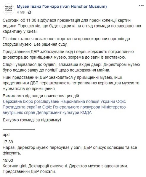 По словам директора музея, правоохранители забрали с собой те самые декларации на картины, которые должны доказывать, что Порошенко владеет ими законно.