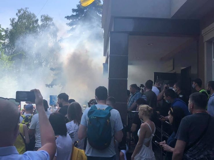 К своей группе поддержки периодически выходит Стерненко, а протестующие палят дымовые шашки и фаера.