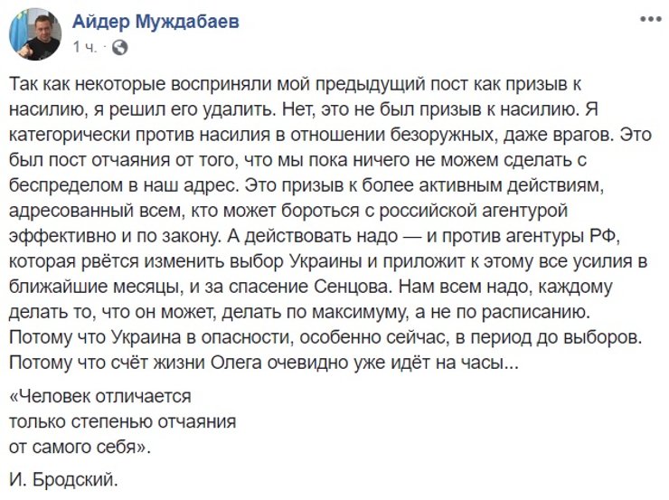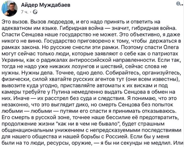 "Как крымский татарин, гражданин и патриот Украины хочу поблагодарить гестапо русского рейха за высокую оценку моего участия в борьбе с ним. Борьба эта будет продолжаться, пока я жив, пока сапог русского оккупанта не пойдет прочь из украинского Крыма и Донбасса. Слава Украине, слава крымским татарам, смерть врагам!", – написал он.