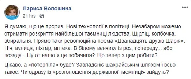 "Это чисто для себя. С экспертизой в Германии. Я лучше вас, потому играть по-вашему не стану. И еще раз привет Тимошенко, он один сделал для падения рейтинга Зеленского больше, чем все критики", - написал Шарий.