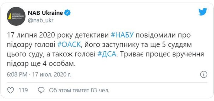 21 июля НАБУ у себя в Twitter сообщило, что в итоге подозрения были вручены 12-ти лицам.