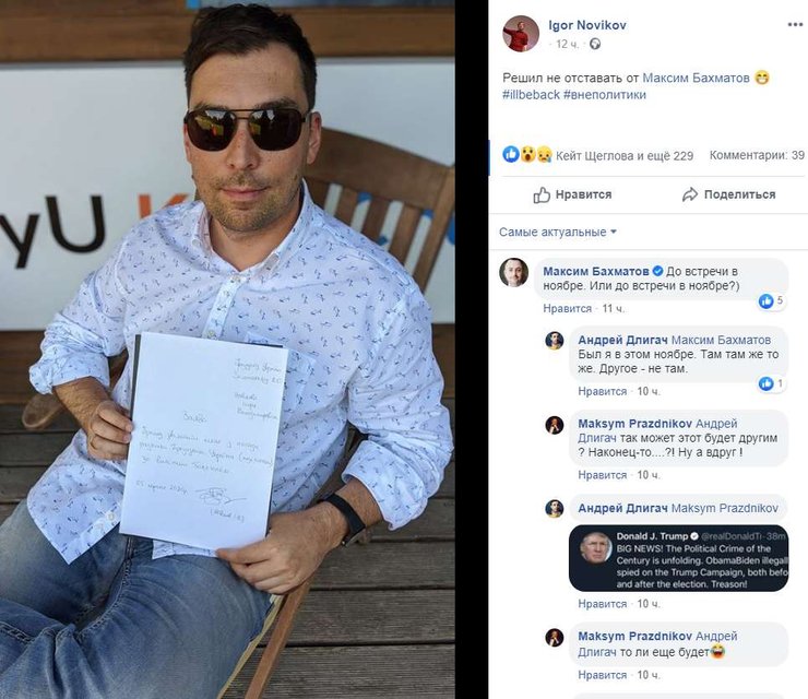 "Решил не отставать от Максима Бахматова 😁 #illbeback #внеполитики", – заявил Новиков и отметил бывшего советника мэра Киева Максима Бахматова.