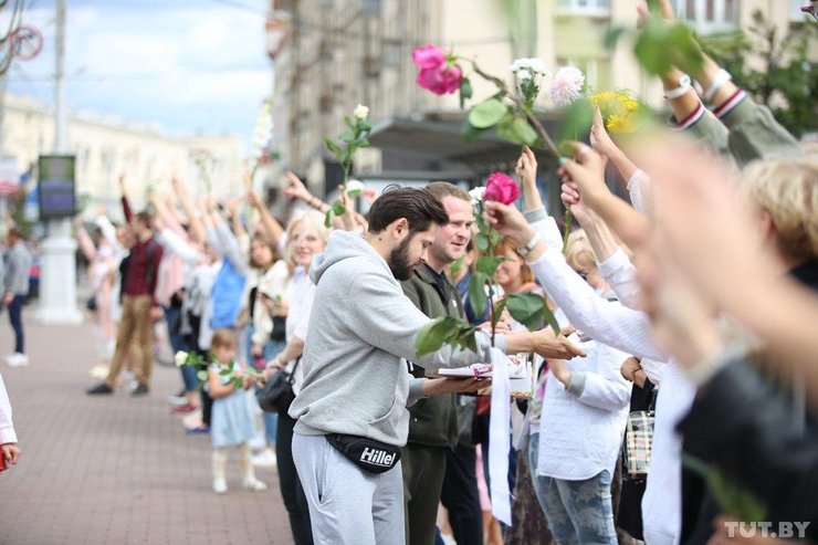 16:51 Также по всей стране продолжают проходить акции солидарности, в которых участвуют женщины с цветами. В Минске белорусы формируют живые цепи солидарности от нескольких десятков человек до нескольких сотен человек.