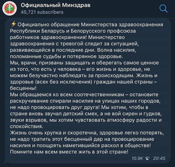 21:22 Минздрав РБ выпустил обращение с призывом остановить насилие.