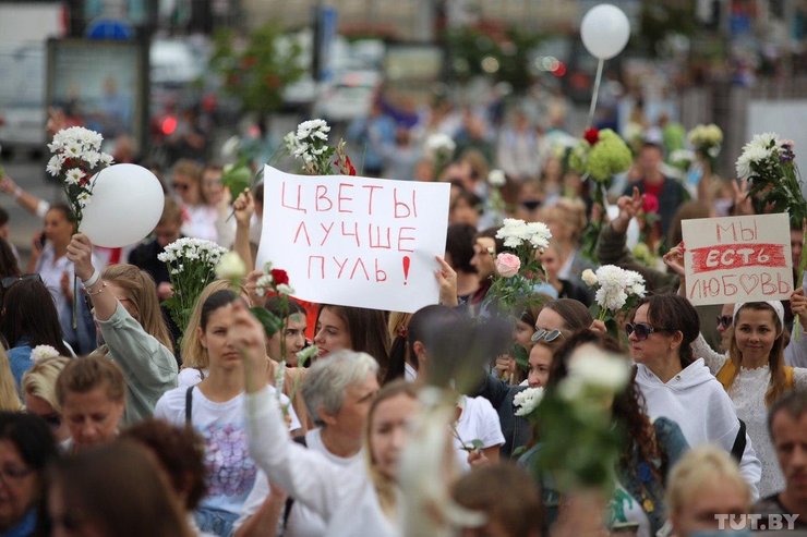 11:52 250 белорусских женщин вышли в белой одежде с цветами на улицы в Минске, чтобы выразить протест насильственным действиям силовиков и солидарность с пострадавшими мирными демонстрантами.