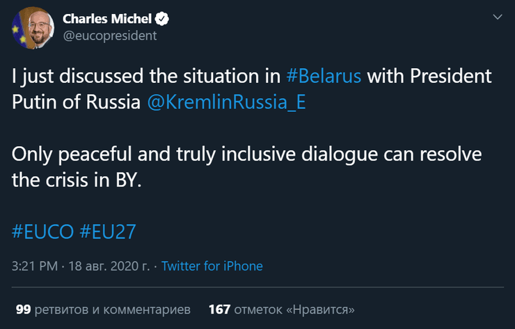 "Я только что обсуждал ситуацию в Беларуси с президентом России Владимиром Путиным. Только мирный и по-настоящему всесторонний диалог может урегулировать кризис в Беларуси", – написал глава Евросовета у себя в Twitter.
