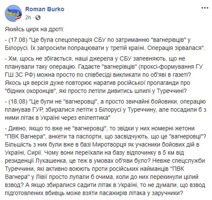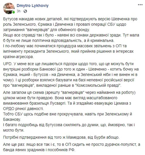 Юрий Бутусов, главред интернет-издания Цензор.НЕТ дополнил имеющуюся информацию на следующий день. Он восстановил хронологию, написав, что начальник ГУР МО Василий Бурба был спешно уволен и прямо заявил, что "Служба безопасности Украины обязана открыть расследование по статье государственная измена, а Верховная Рада обязана создать следственную комиссию по проверке причастности президента Владимира Зеленского и его ближайшего окружения к утечке информации, к срыву секретной операции СБУ и ГУР МО по задержанию террористов в Беларуси".