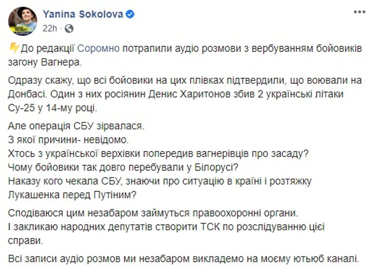 Также ведущая "5 канала" Янина Соколова сначала анонсировала, а потом и опубликовала записи, на которых агент СБУ ведет переговоры с несколькими "вагнеровцами", которые подтверждают, что воевали на Донбассе. В частности, принимали участие в "освобождении Луганска".