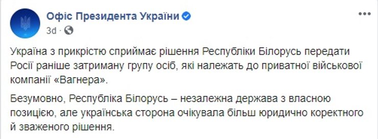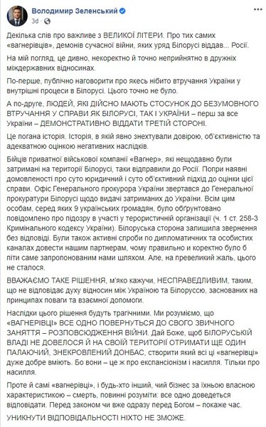 Но результаты выборов внесли коррективы в этот план. Беларусь захлестнули протесты и беспорядки, трон под Лукашенко закачался и "вагнеровцы" оказались в России. 9 граждан Украины, выдать которых требовали даже в Офисе президента, на родину не уехали. На это, надо напомнить, Офис президента отреагировал сдержанно, но зато президент Зеленский - весьма эмоционально, написав гневный пост с большим количеством капслока и намеками на то, что Александр Лукашенко вскоре испытает последствия своего опрометчивого решения.