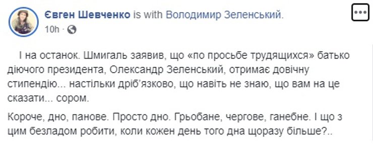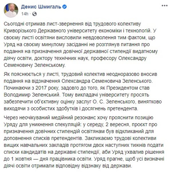 Вроде вопрос был исчерпан, но на сцене появился премьер-министр Денис Шмыгаль, который сообщил, что "трудовой коллектив Криворожского Государственного университета экономики и технологий" недоволен тем фактом, что Кабмин не рассмотрел вопрос о представлении на назначение пожизненной государственной стипендии отцу президента Александру Зеленскому".