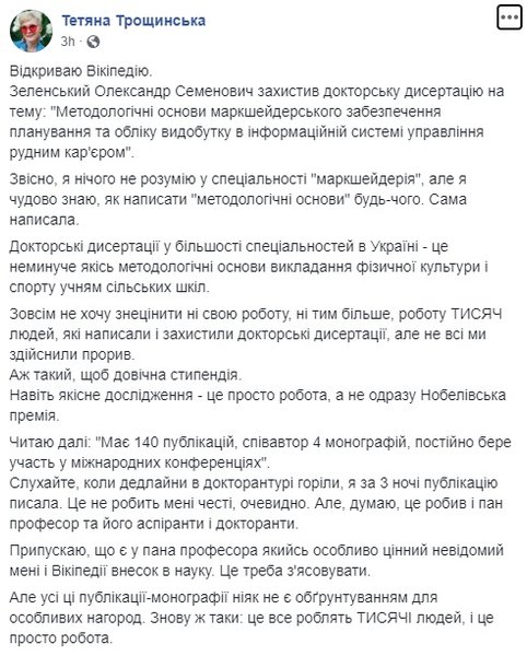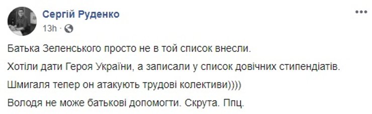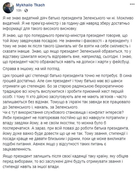 "И меня на стипендию выдвинули не потому, что я папа Зеленского, – оно мне не надо. Коллектив института меня выдвинул, на научном совете. Я даже не знал результат – вот это впервые от вас слышу. А вы думаете, это блат от президента? Вы знаете, что и президент не бедный. И мне хватает и зарплаты, и пенсии. Я 28 лет на объектах проработал, на живых, а не на взятках. Моя позиция – что надо награждать людей в высшей школе, это правильно. А что, нужно было запретить коллективу выдвигать мою фамилию? Они меня выдвинули, я при чем? Меня подавали уже на заслуженного деятеля науки и техники, и т.д., я отказывался. А в этот раз решил не отказываться. А почему я должен отказываться?", - резюмировал Зеленский-старший.