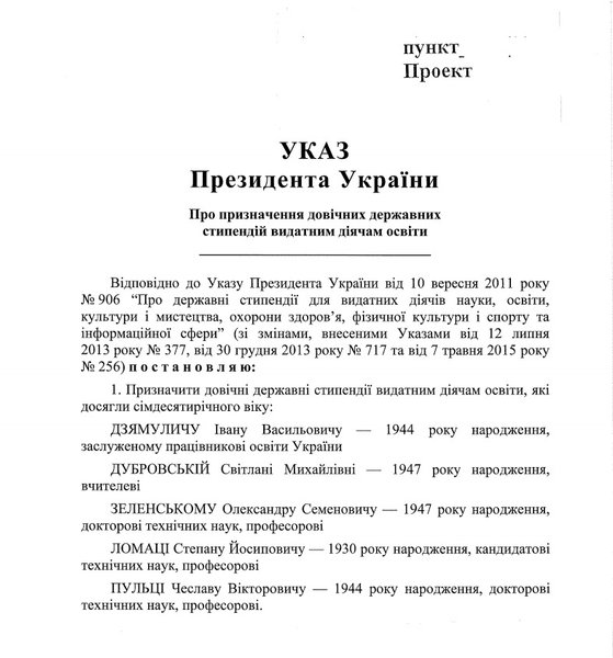 Безотносительно отца президента, интересен 8 пункт пояснительной записки. Там говорится, что никакой дискриминации в указе нет. Однако в списке четверо выдающихся деятелей мужского пола и только одна дама. Это Дубровская Светлана Михайловна, преподаватель украинского языка из Сумской гимназии №1 с многолетним стажем работы.