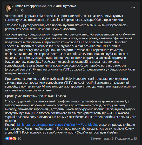 "В Управлении Верховного комиссара сообщили, что к ним действительно обращалось агентство "РИА Новости" (на публикацию которой ссылаются "Ведомости") по вопросу поставок воды в Крым, на что медиа получили буквально следующий ответ: "Российская Федерация как оккупационная власть несет главную ответственность за обеспечение доступа к воде лиц, находящихся под защитой (protected persons)", – написала замглавы украинского МИДа у себя в Facebook.