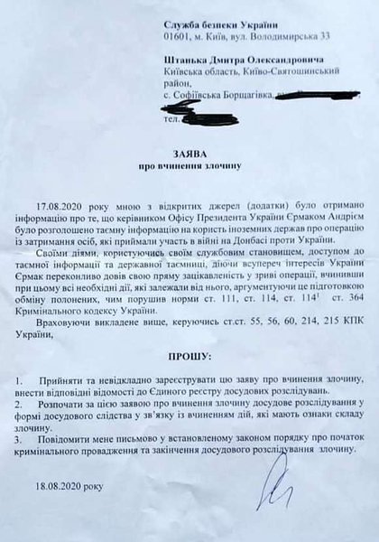 В своем иске, который был удовлетворен Шевченковским судом, Штанько пишет, что СБУ с 18 августа отказывается регистрировать его заявление о совершении Андреем Ермаком госизмены.