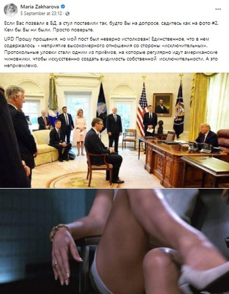 Напомним, основанием для скандала стал пост представителя МИД РФ Марии Захаровой 5 сентября, посвященный визиту Вучича в Вашингтон. В нем она сравнила президента Сербии с героиней Шерон Стоун из "Основного инстинкта", предложив тому закинуть ногу на ногу, сидя перед Трампом.