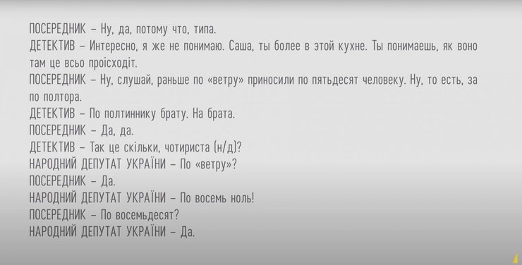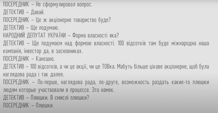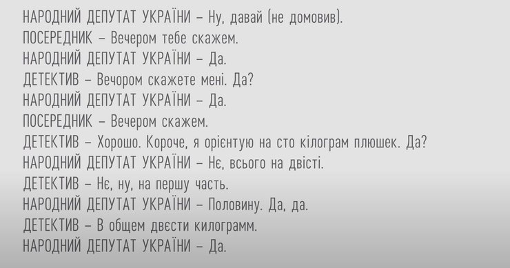 Потом посредник, помощник нардепа, заговорил о "плюшках", которые нужно будет раздать людям, которые участвовали в процессе.