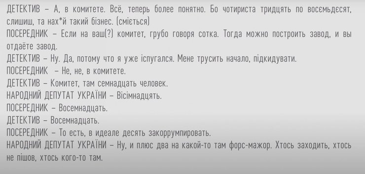 А при переговорах с нардепом несколько позже, разговор уже зашел о том, сколько нужно передать каждому народному депутату в комитете, чтобы дело "выгорело". По 50-80 тысяч долларов каждому, а так как всего их в комитете 18, то 12 человек именно то количество, которое придется подкупить, чтобы все прошло хорошо.