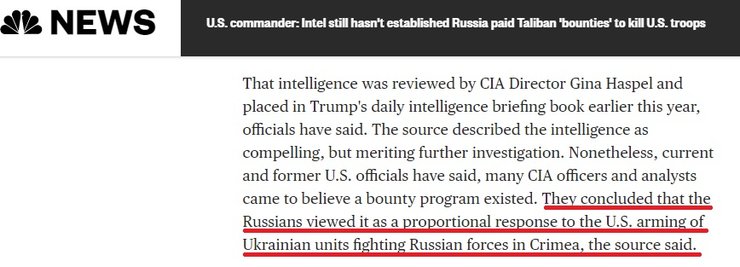 Материал NBC News, о котором идет речь, посвящен возможному поощрению Россией террористических атак "Талибана" на солдат США в Афганистане. Генерал Фрэнк Маккензи, командующий силами США в Афганистане, сообщил журналистам канала, что подозрение о таких связях все еще не развеяно, данные разведки не дают возможности дать окончательный ответ.
